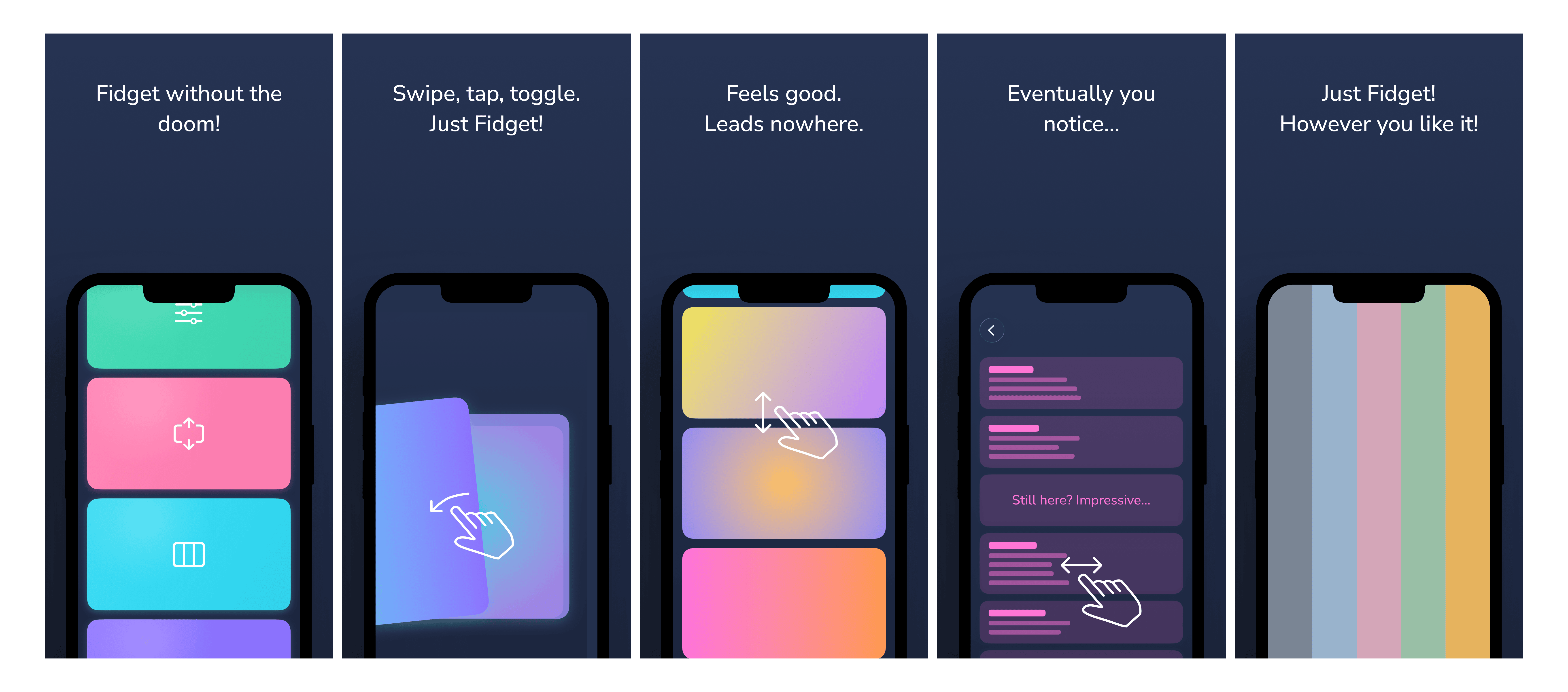Design, illustration, and development - the entire app from concept to release. I designed each fidget interaction to feel tactile and satisfying, created the visual system of colored squares, and built the app. The challenge was making something that feels good to use without any of the hooks that make apps addictive.